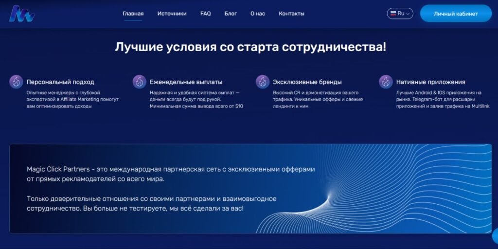 Для траффик-команд Magic Click предлагает персональные условия: увеличенные ставки, ускоренные выплаты и работу с отдельным менеджером, который помогает масштабироваться и подбирает офферы под стратегию команды.