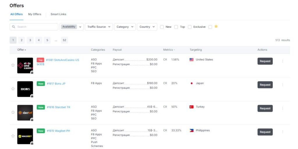 Работают как с казино-брендами, так и с беттинг-платформами. Новые офферы добавляются почти каждую неделю, так что без свежих связок вы не останетесь.