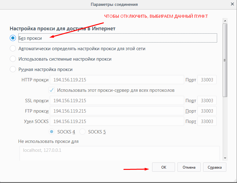 Отключение происходит по тому же алгоритму, только в «Настройке прокси для доступа в Интернет» выбираете «Без прокси» или «Использовать системные настройки прокси».